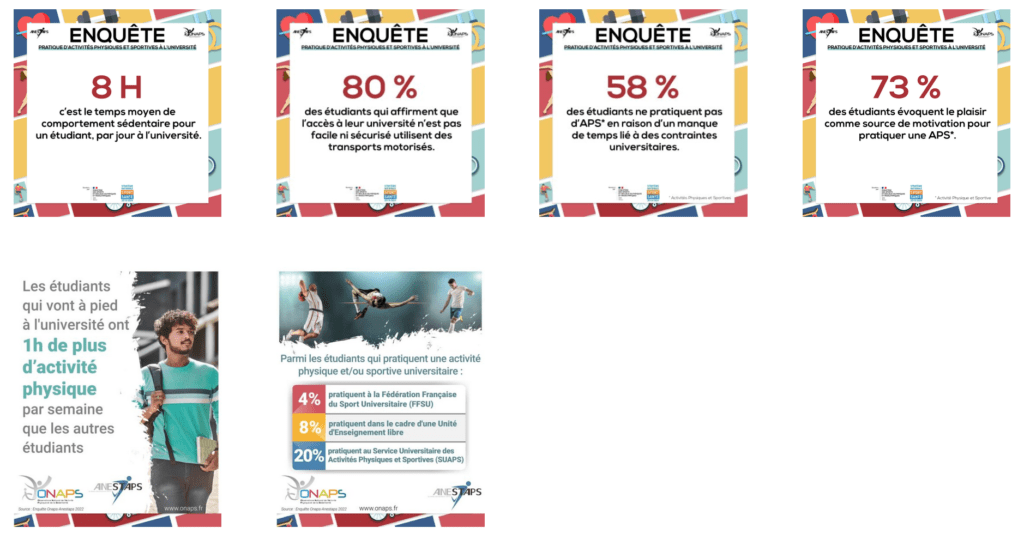 L’ANESTAPS et l’Onaps, avec le soutien du Ministère des Sports et des Jeux Olympiques et Paralympiques dans le cadre de la Stratégie Nationale Sport-Santé, et sous le haut-patronage du Ministère de l’Enseignement Supérieur et de la Recherche, ont lancé en janvier dernier une grande enquête sur la pratique d’activités physiques et sportives à l’université. À l’issue d’une phase de promotion de l’enquête auprès du public étudiant et des acteurs universitaires menée par l’ANESTAPS et l’Onaps, les données recueillies et analysées par l’Onaps ont permis aux deux structures de formuler conjointement de nombreuses recommandations pour améliorer la place des activités physiques et sportives à l’université.