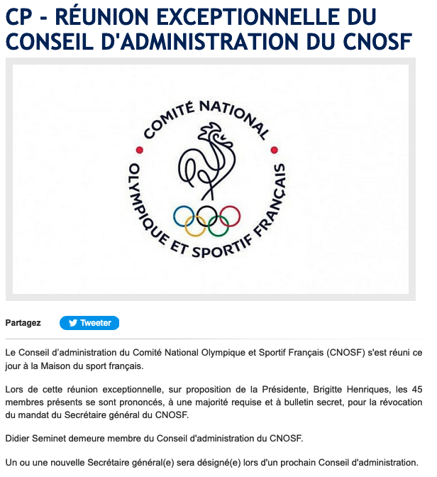Dans Le Parisien Sandrine Lefevre qui cite un spécialiste des instances sportives parle « un acte d’autorité » Exclusion du secrétaire général du CNOSF, Didier Seminet : le mouvement sportif divisé à deux ans des JO Le Parisien