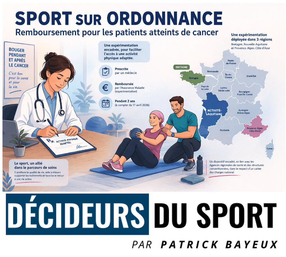 Publié au Journal officiel du 16 avril 2026, le décret du 14 avril lance une expérimentation de deux ans permettant le remboursement de séances d’activité physique adaptée pour des patients atteints de cancer. Une mesure attendue, encadrée et territorialisée, qui marque une étape dans l’intégration du sport dans le parcours de soins.