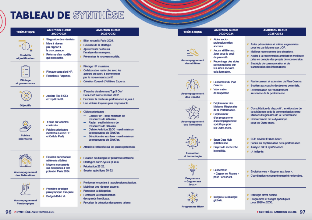 Cette stratégie se décline en actions opérationnelles : identification de cibles prioritaires (Cellule Perf, Radar, Cellule Ambition), accompagnement des fédérations, entraîneurs, territoires et athlètes, soutien renforcé aux disciplines paralympiques et structuration spécifique pour les Jeux d’été comme d’hiver. Avec une trajectoire reliant Milano-Cortina 2026, Los Angeles 2028, les Jeux des Alpes françaises 2030 et Brisbane 2032, Ambition Bleue se positionne comme un cadre durable, pensé pour faire performer la France le jour J et maintenir son rang parmi les grandes nations sportives.