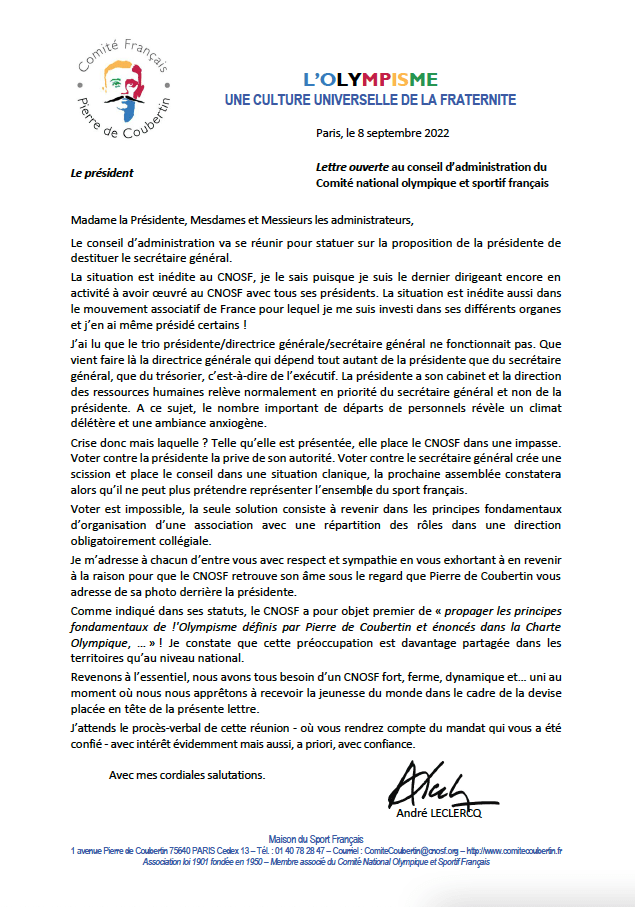 Dernier dirigeant encore en activité à avoir oeuvré au CNOSF avec tous ses présidents, André Leclecq (ancien VP du CNOSF et ancien président de la fédé de volley) actuellement président du Comité Français Pierre de Coubertin invite les membres du CA « à revenir à la raison pour que le CNOSF retrouve son âme sous le regard que Pierre de Coubertin vous adresse de sa photo derrière la présidente. »