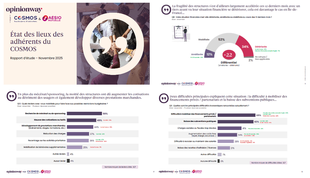 Réalisé entre fin septembre et fin octobre 2025, le baromètre OpinionWay pour le COSMOS met en lumière une fragilité financière croissante des structures sportives : seules 54 % jugent leur situation bonne et 19 % la considèrent déjà fragile, un chiffre en hausse. Un tiers déclare une dégradation de leur situation au cours de l’année écoulée. Deux facteurs principaux expliquent cette tension : 65 % peinent à lever des financements privés et 62 % subissent une baisse des subventions publiques, pourtant jugées indispensables par 89 % des répondants. Deux tiers des structures assujetties ont vu leurs aides diminuer, provoquant réductions d’activités, reports de projets ou suppressions de postes. Pour compenser, elles se tournent vers leurs propres revenus d’activité et les partenariats privés, et 50 % ont augmenté les cotisations, pesant sur les usagers.