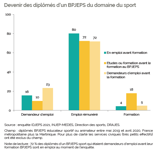 Selon une étude récente publiée par l’INJEP environ 10 600 personnes ont obtenu un brevet professionnel de la jeunesse, de l’éducation populaire et du sport (BPJEPS) entre mai 2019 et avril 2020 (hors équivalence) soit un volume comparable aux années précédentes. Ces nouveaux diplômés ont été enquêtés début 2021 afin de connaître leur situation et leur insertion professionnelle. Ainsi, au moins 9 mois après leur sortie de formation, près de huit diplômés sur dix sont en emploi. Parmi eux, 74 % déclarent que leur emploi principal est en relation directe avec leur formation BPJEPS : 71 % dans le sport et 81 % dans l’animation. Avant leur entrée en BPJEPS, quelle que soit la spécialité, un quart des diplômés étaient demandeurs d’emploi.