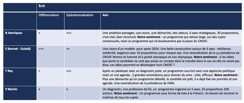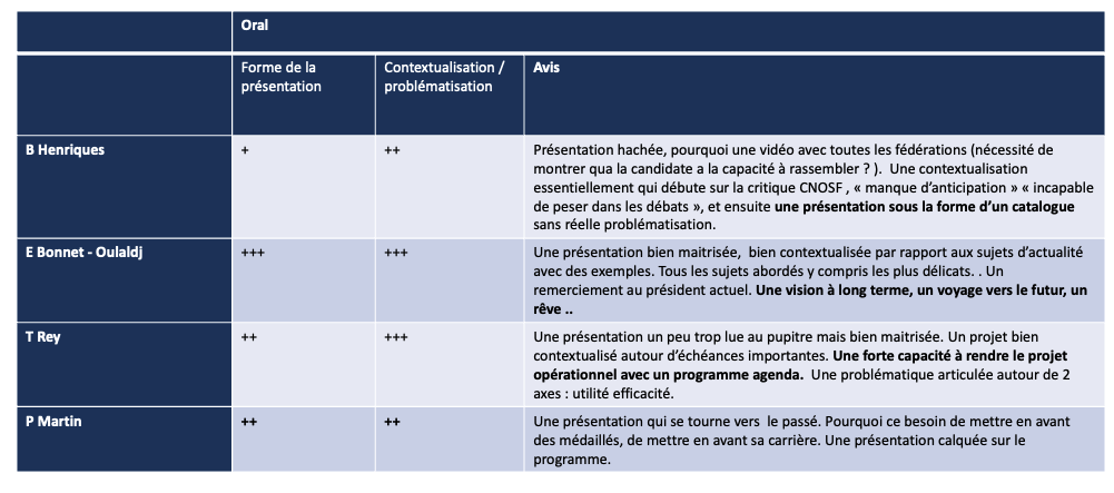 Période des examens oblige, et aprés avoir fait passer un certain nombre de soutenances de mémoires, sur ma lancée je n’ai pas pu résister à noter les candidats à la présidence du CNOSF.