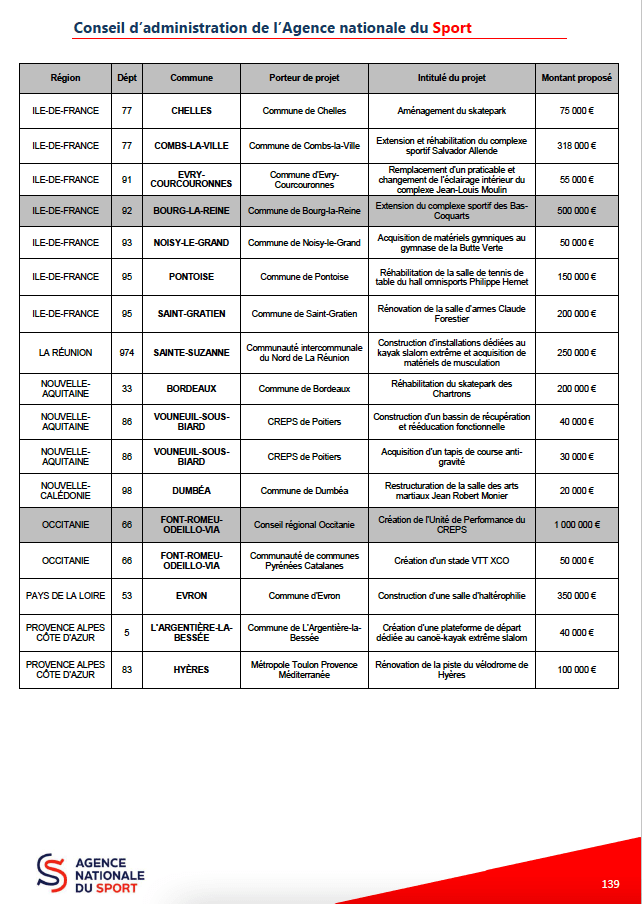 En 2021, l’Agence a financé 42 dossiers à hauteur de 14 M€ pour l’aménagement, la reconversion, la rénovation ou la construction d’équipements sportifs ou annexes références CPJ,