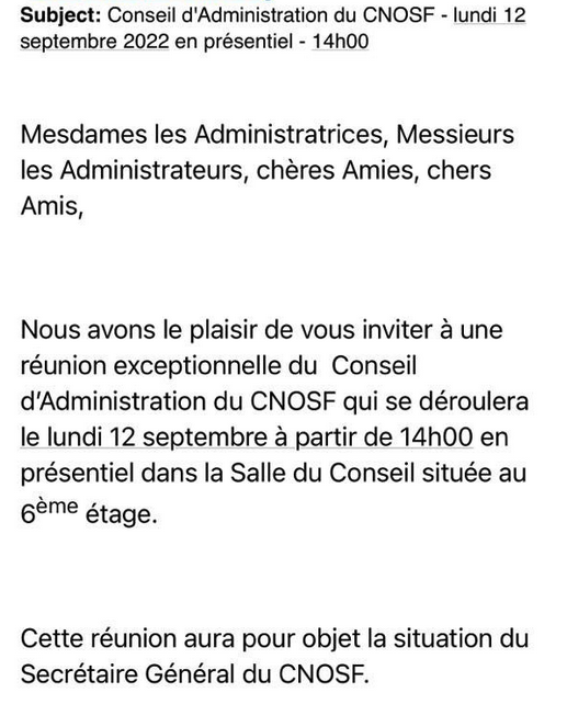 La situation est grave au CNOSF, à tel point que Guy Drut membre du CIO et membre du conseil d’administration du CNOSF depuis 26 ans a écrit à la présidente du CNOSF B Henriques. Il porte la parole de tous les membres du CIO : JC Rolland, David Lappartient et Martin Fourcade.