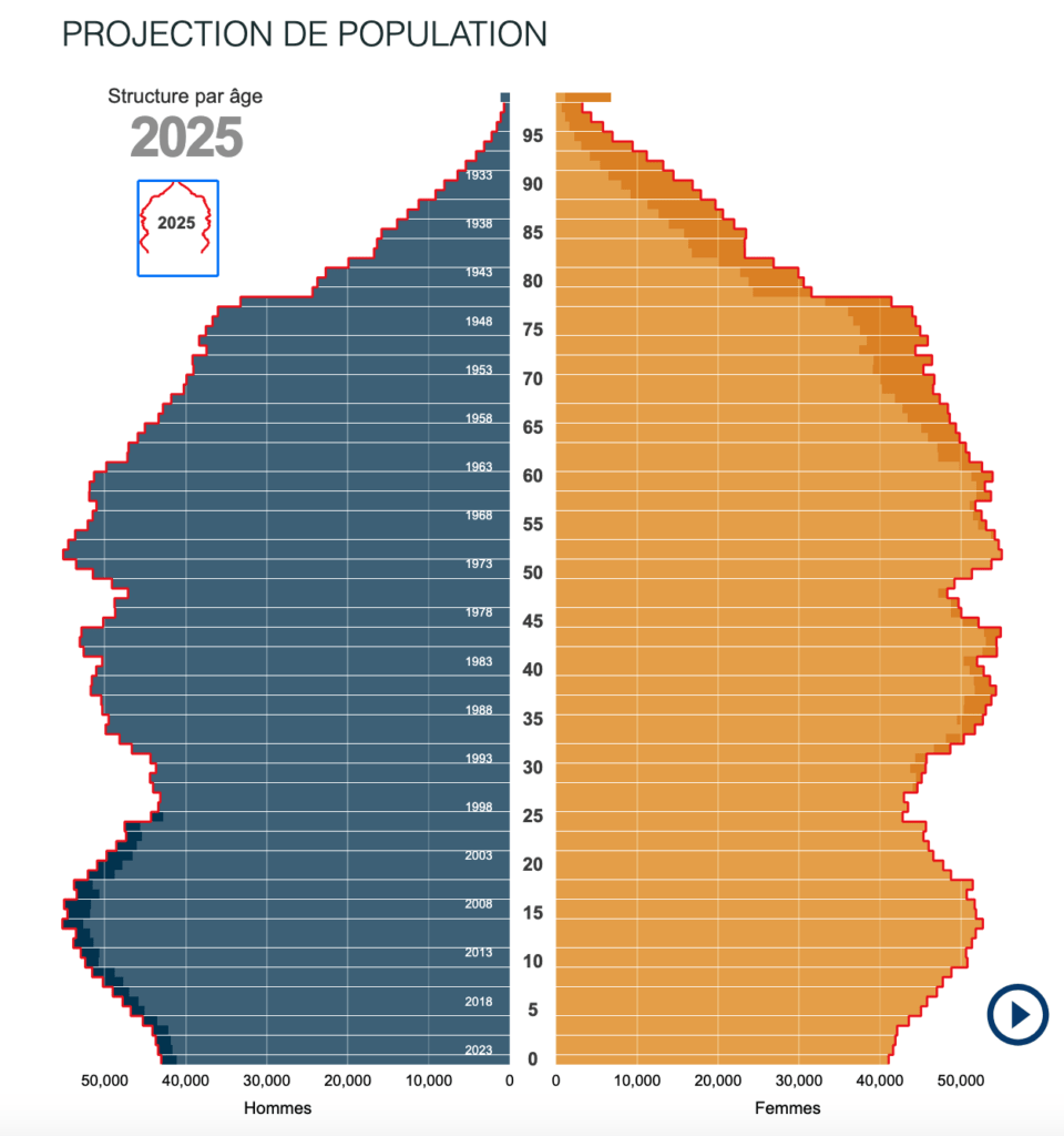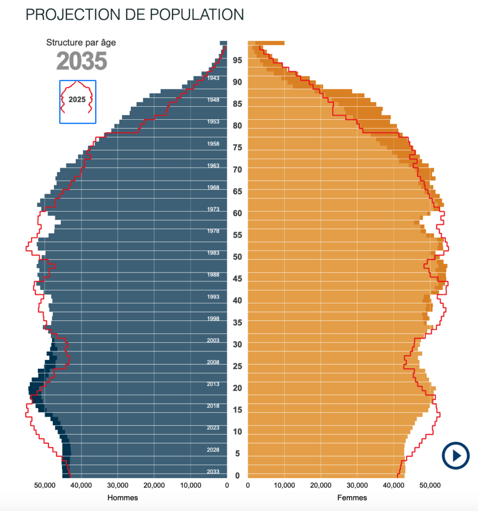 La comparaison des pyramides de population 2025 / 2035 est sans ambiguïté :
