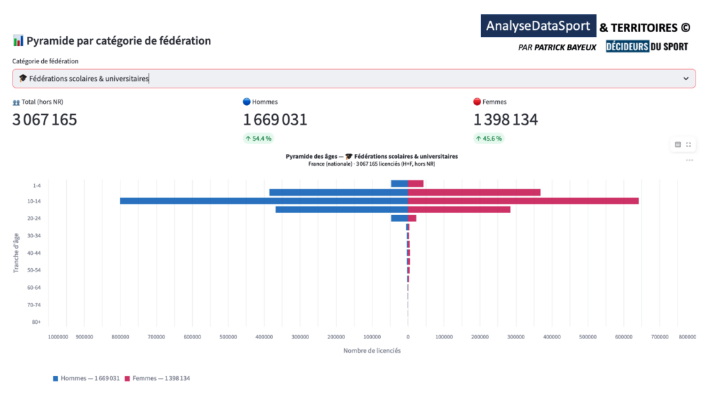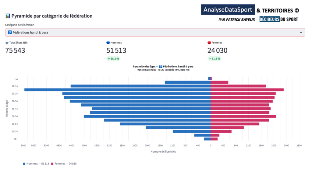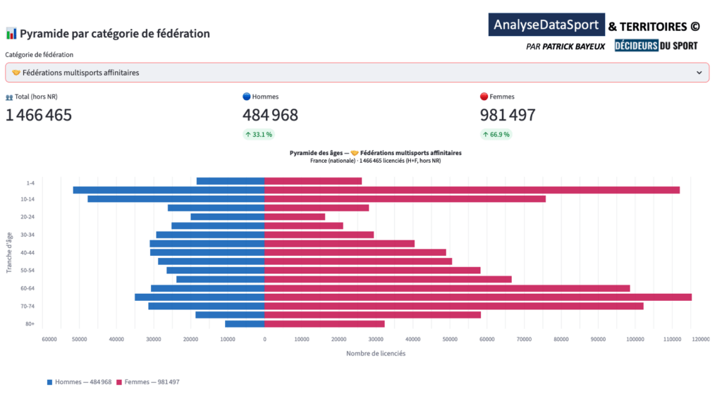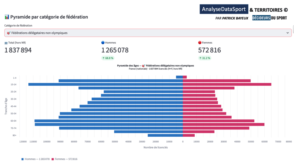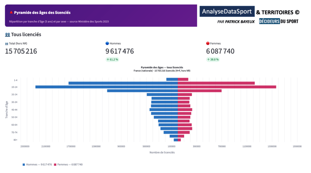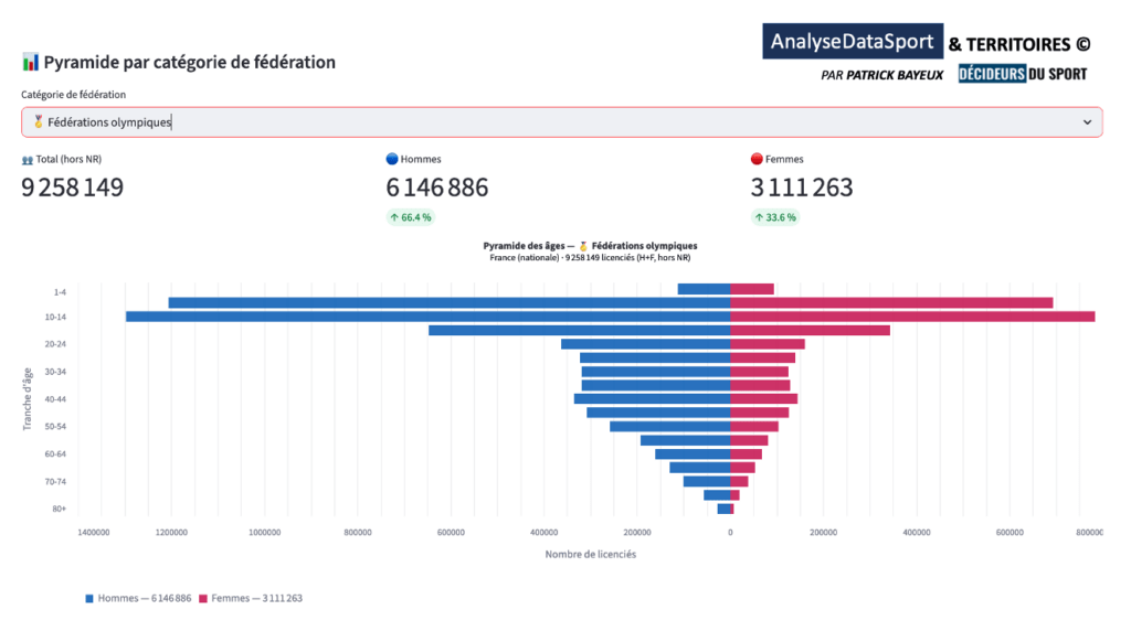 Cette évolution n’est pas neutre pour le sport. Elle remet en cause les fondamentaux de nombreuses politiques publiques et du modèle fédéral français, historiquement construit sur une base large de jeunes pratiquants. En croisant ces projections avec les pyramides des âges des licenciés, un constat s’impose : le sport entre dans une phase de transition démographique profonde.