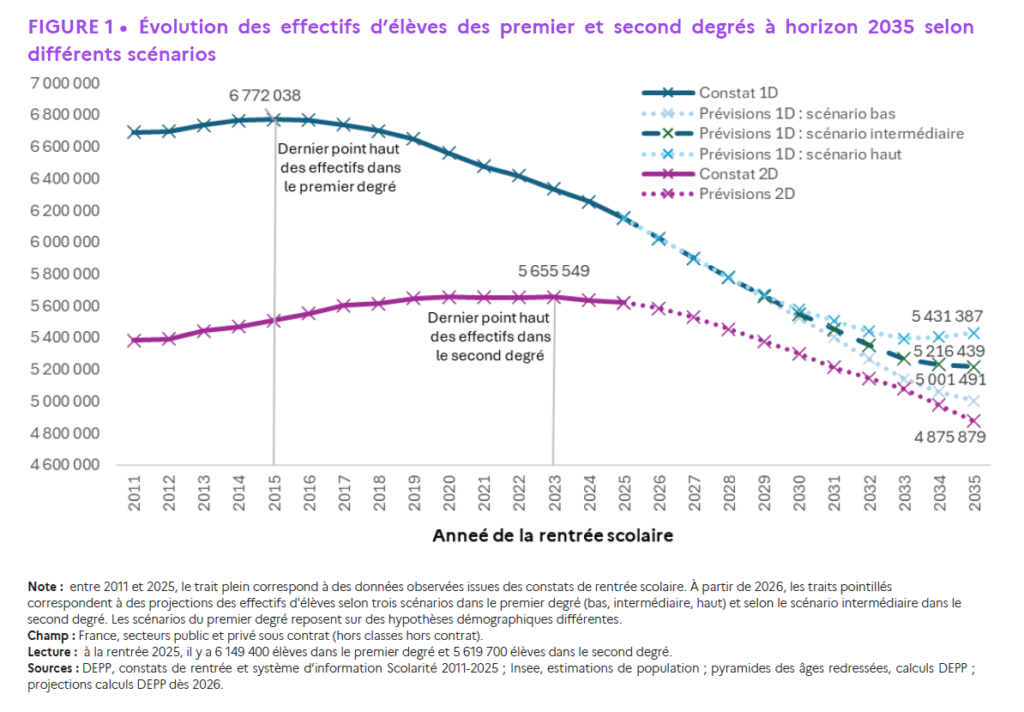 Le phénomène est d’abord démographique : la baisse des naissances depuis 2010 réduit mécaniquement la taille des générations entrantes dans le système éducatif .