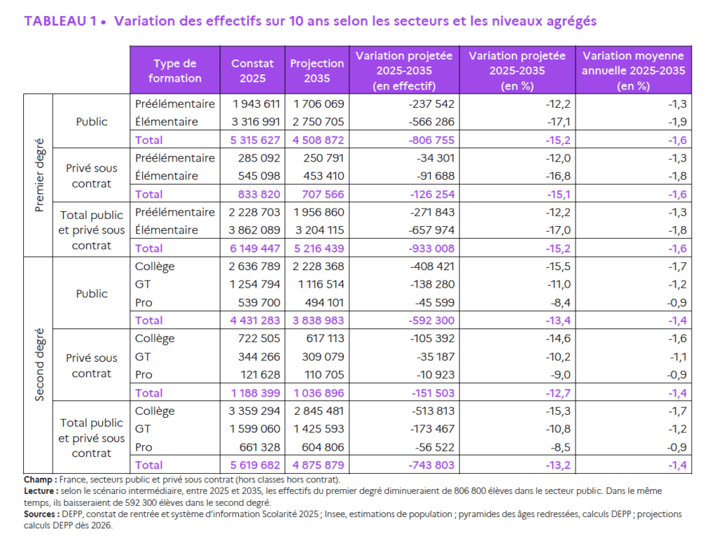 La publication de la DEPP sur les projections d’effectifs scolaires à horizon 2035 confirme un basculement démographique majeur. D’ici dix ans, la France comptera 1 676 800 élèves en moins, soit une baisse de 14,2 % des effectifs scolaires . Ce recul, amorcé depuis plusieurs années, s’accélère et touche désormais l’ensemble du système éducatif, du premier degré jusqu’au lycée.