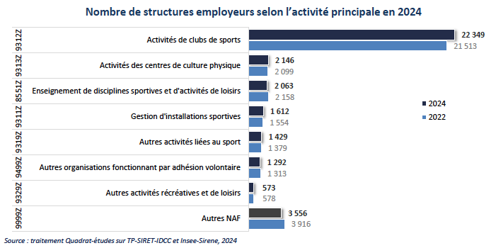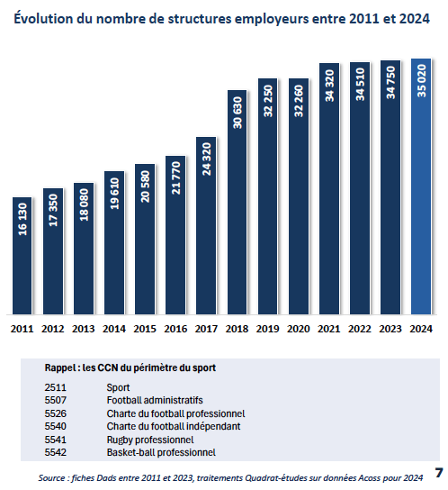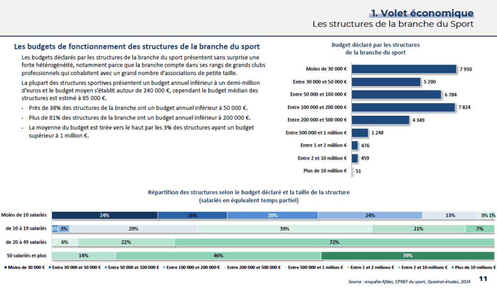 La branche du sport compte environ 35 020 structures employeurs en 2024, contre 18 080 en 2013, soit une progression de +93 % . Cette évolution s’explique notamment par le rattachement progressif de structures à la convention collective du sport et par la croissance des pratiques sportives. Les structures sont majoritairement de petite taille : 90 % comptent moins de 10 salariés et 58 % moins de 3 salariés. La branche est également très majoritairement composée de structures associatives, qui représentent 79 % des employeurs, dont une large part de clubs sportifs amateurs.