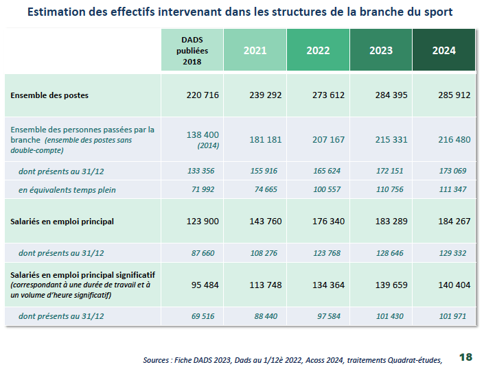En 2024, 184 267 personnes sont salariées en emploi principal dans la branche du sport . Le nombre de postes occupés atteint près de 286 000, traduisant la diversité des modes d’intervention. La pluriactivité constitue une caractéristique importante du secteur, avec environ un tiers des salariés cumulant plusieurs activités professionnelles. Le développement du travail indépendant est également notable, avec plus de 76 000 micro-entrepreneurs recensés dans les activités sportives.
