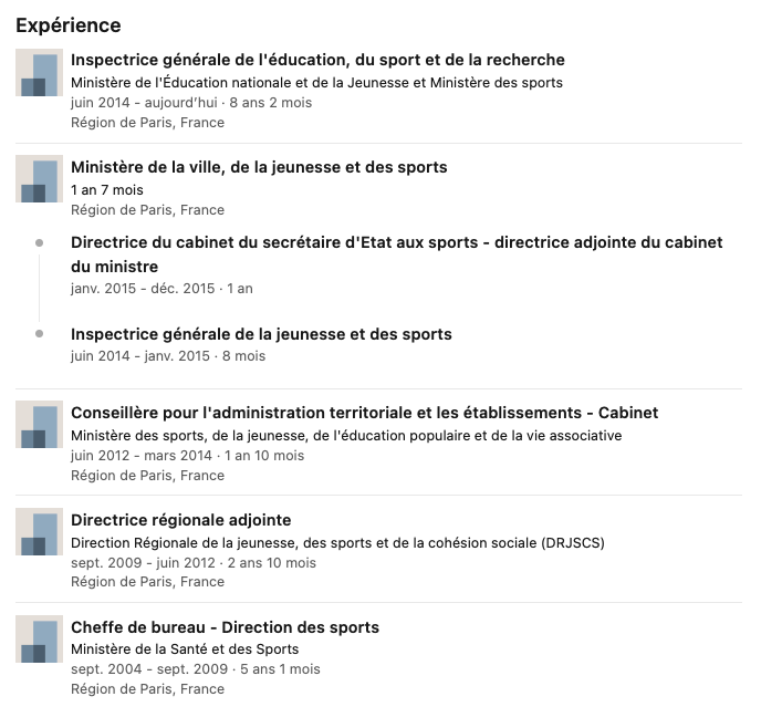 Née en oct 1965 titulaire d’une DEA de droit public, Fabienne Bourdais a fait toute sa carrière au sein du ministère des sports.