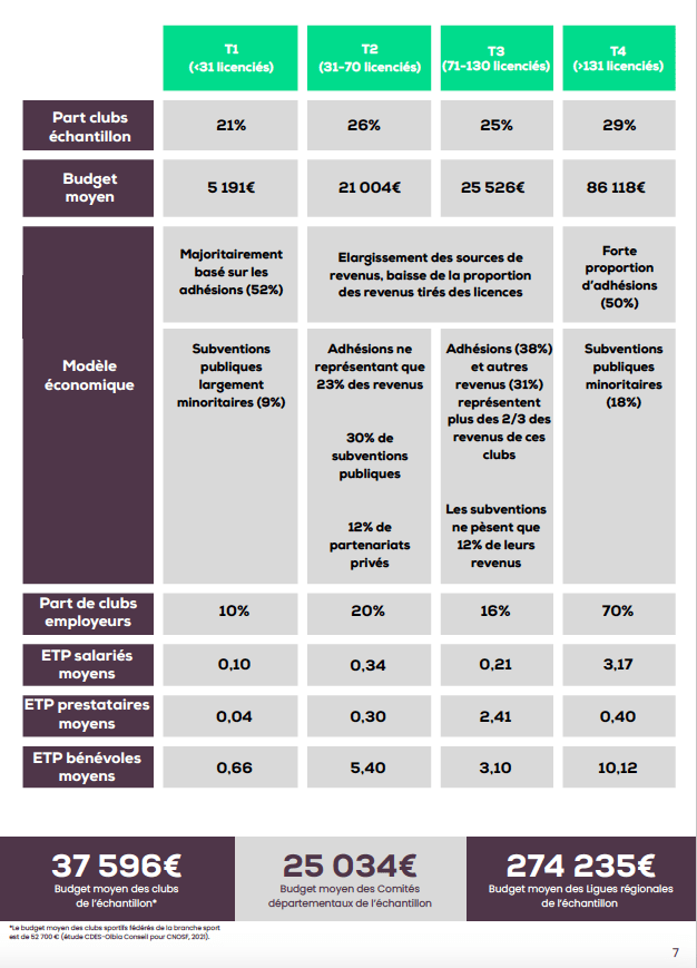 - Budget moyen : 37 596 € pour les clubs, 25 034 € pour les comités, 274 235 € pour les ligues