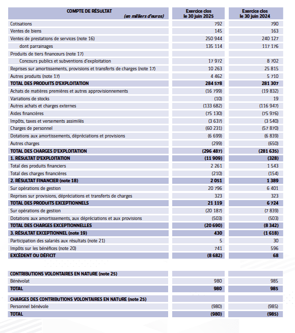 Le Rapport financier 2024-2025 dresse le bilan au 30 juin 2025 ainsi que le compte de résultat de l’exercice écoulé, complétés par leurs annexes.