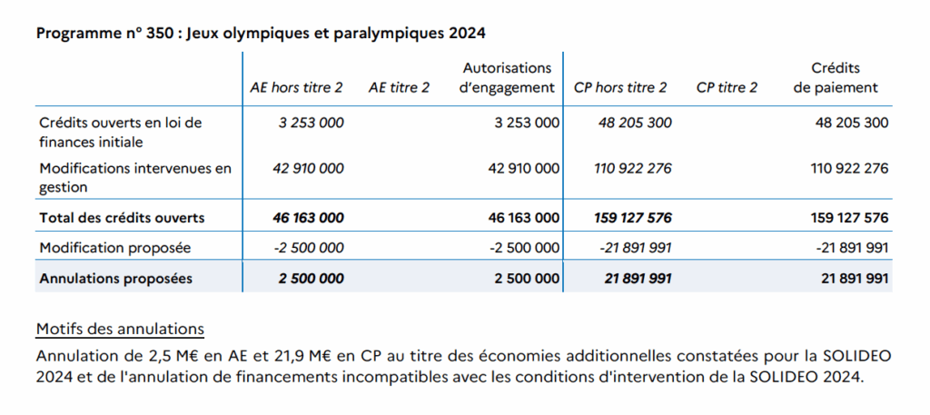 Alors que les prélèvements sur les paris sportifs une augmentation de +142 488 781 par rapport aux prévision, ce sont 46 millions d’euros de crédits de paiement, et 142 millions d’euros d’acte d’engagement qui sont annulés dans ce projet de loi de finance de fin de gestion pour l’année 2025. Le PLFG 2025 vise à « procéder aux ajustements de crédits indispensables à la fin de la gestion de l’année » Un prélèvement sur la réserve de précaution selon le document de présentation du projet de loi.