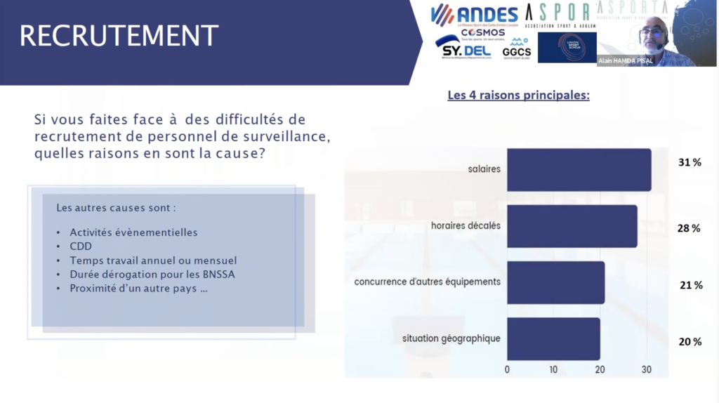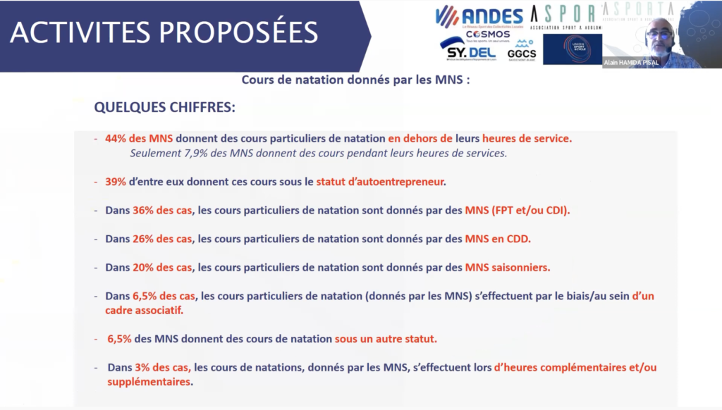L’enquête porte également sur les MNS, leur statut, les activités, le cumul d’emploi, la difficulté de recrutement, … Elle révèle que presque la moitié des MNS donnent des cours en dehors de leurs de services.