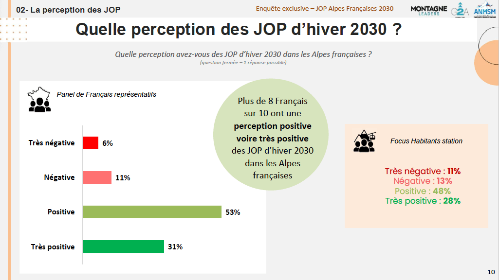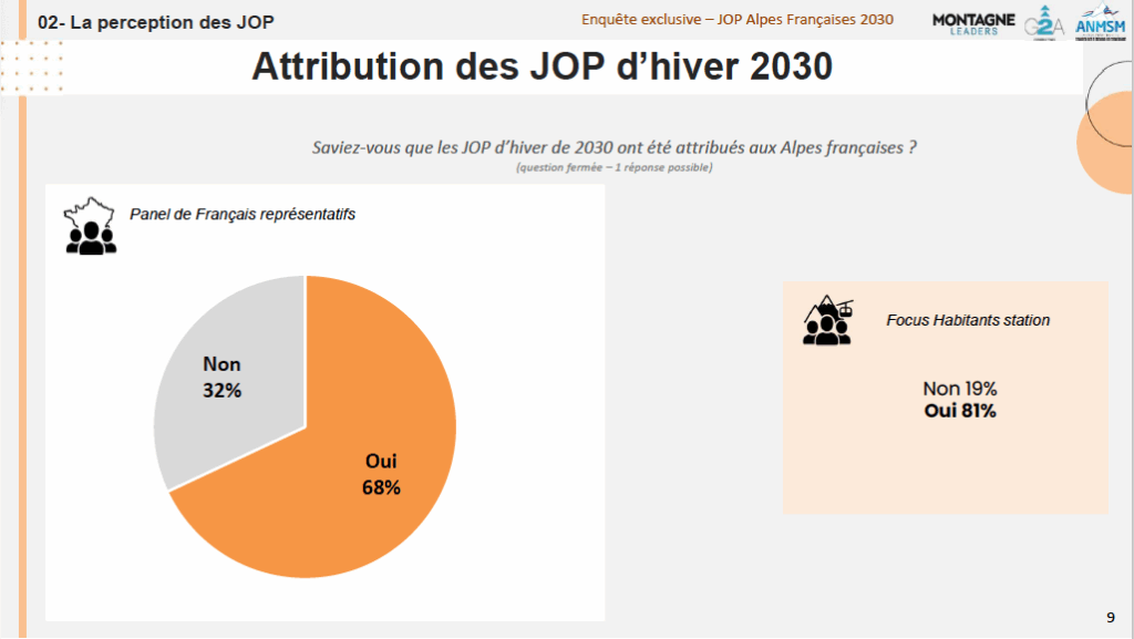 Selon ce sondage L’étude G2A – ANMSM – Montagne Leaders, près de neuf Français sur dix ont une perception positive des Jeux d’hiver, et plus de huit sur dix accueillent favorablement leur tenue dans les Alpes françaises, même si selon le sondage 68 % étaient informés que les jeux avaient été attribués aux Alpes Françaises …..