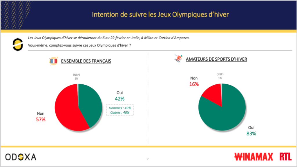 Réalisé les 7 et 8 janvier 2026 auprès de 1 005 Français, le baromètre Odoxa pour Winamax et RTL montre que 42 % des Français comptent suivre les Jeux Olympiques d’hiver de Milan-Cortina, un niveau d’attention élevé pour des olympiades hivernales à un mois de leur ouverture. L’intérêt est encore plus marqué chez les amateurs de sports d’hiver, dont 83 % déclarent vouloir suivre la compétition.