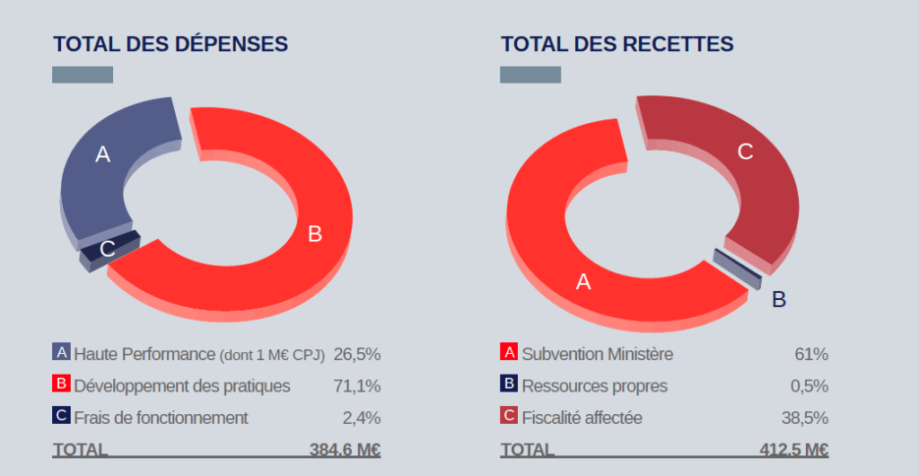 Les recettes sont constituées de financements publics pour 411,4 M€. Les recettes qui relèvent du mécénat et partenariats s’élèvent à 2,4 M€ (CNOSF, COJO, FDJ, et CPSF).