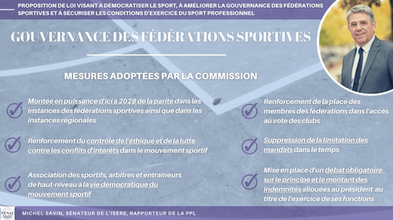 Les mesures proposées par le CNOSF ont été pour parties prises en compte. A noter qu’en matière de partité la commission a instauré une mise en oeuvre par étapes de la parité intégrale dans les instances de direction des fédérations (art. 5). Un mixte entre la PPL initiale et la proposition du CNOSF Pour les instances dirigeantes nationales, la commission prévoit d’adopter la parité intégrale dès 2024 dans les fédérations dont la proportion de chacun des deux sexes est supérieure à 25 %. Pour les autres, elle a retenu une représentation au moins égale à 40 % des sièges des membres élus à compter de 2024 puis une représentation paritaire en 2028.