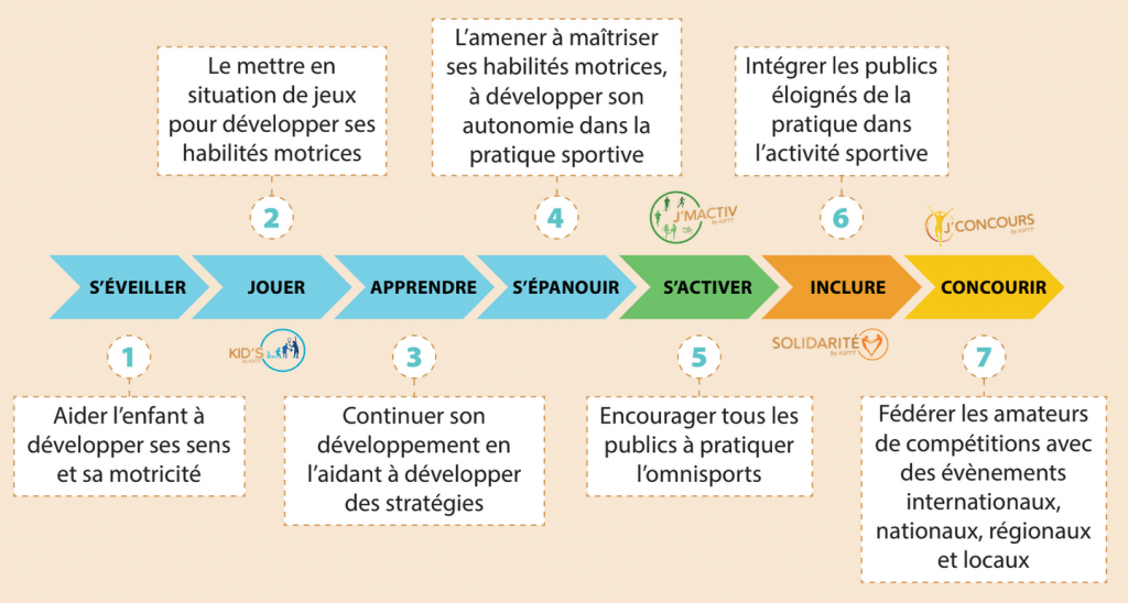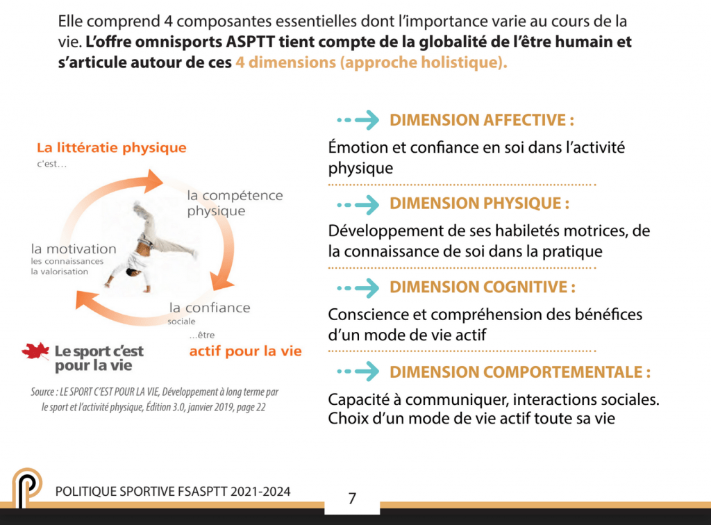Le 1er axe de la politique sportive de la FSASPTT sur 2021 2024 est limpide : l’offre omnisports by ASPTT : 01 la littératie physique, comment être actif tout au long de la vie ? et de préciser « En faisant de l’omnisports le cœur de son Projet Fédéral, l’ASPTT Fédération Omnisports propose non seulement :