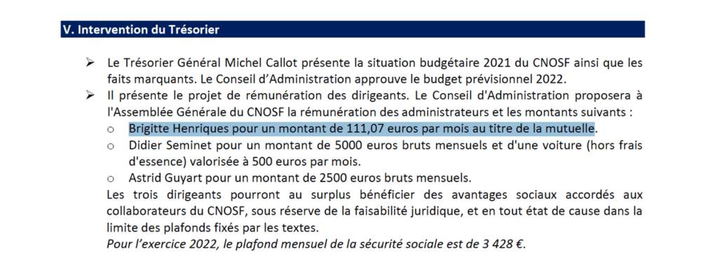 On se souvient que la présidente du CNOSF a posé lors du débat aux candidats à la présidentielle le 17 mars dernier la seule question sur le bénévolat, elle qui est la bénévole la plus rémunérée de France et qui avait fait voté une semaine avant la prise charge de sa mutuelle pour un montant de 111,07 € par mois La nouvelle gouvernance et son organisation à l’ordre du jour de l’AG du CNOSF (aprés avoir fait voter un salaire de 9000 € en septembre dernier En 3 h le CNOSF a changé le statut du dirigeant sportif français)
