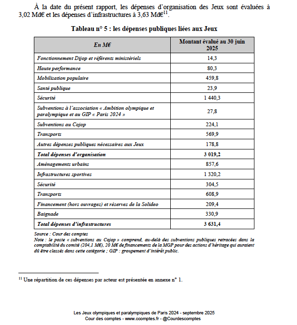 Le chiffre est tombé 6,6 milliards d’euros. Il était attendu suite à la publication du premier rapport en juin. Les dépenses publiques liées l’organisation sont estimées à 3,02 Md€ et les dépenses d’infrastructures à 3,63 Md€.