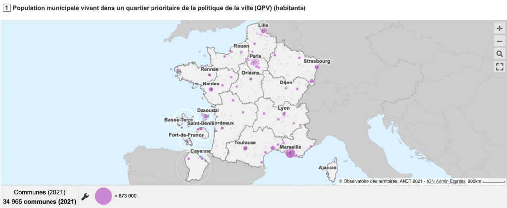 Au 1er janvier 2018, 5,4 millions d’habitants étaient recensés dans les 1.436 QPV de France métropolitaine et d’outre-mer, soit 8% de la population. L’Insee indique que ce nombre d’habitants est restée stable entre 2013 et 2018 (+ 6.000 habitants). 801 communes abritent au moins un QPV en 2018.