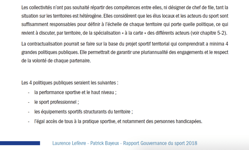 Il convient de rappeler que le fondement même de la réforme de la gouvernance sur les territoires qui était de définir des spécialisation à la carte. page 36 du rapport sur La nouvelle gouvernance du sport (2018) Patrick Bayeux Laurence Lefèvre
