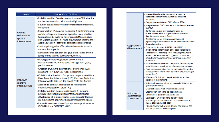 « Pour une nouvelle coordination du sport français l’international permet d’envisager de construire dès aujourd’hui un des héritages de Paris 2024 sous un jour nouveau : celui de l’attractivité et de l’influence sportive internationale de la France » annonce d’emblée le rapport.
