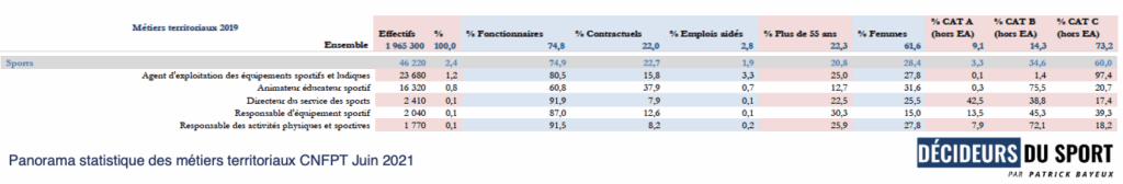 Le nombre d’agent travaillant dans les services des sports des collectivités territoriales peut être estimé à partir d’un approche métiers. Ainsi selon l’Observatoire de l’emploi, des métiers et des compétences de la fonction publique territoriale (2021), 46 220 emplois sont affectés à « un métier sportif « .