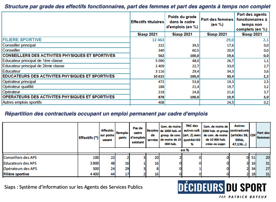 On estime à environ 17 000 personnes le nombre d’agents recrutés sur un cadre d’emploi de la filière sportive dont prés de 12500 fonctionnaires. (source rapport sociaux uniques 2021, DGCL – CNFPT avril 2024 )