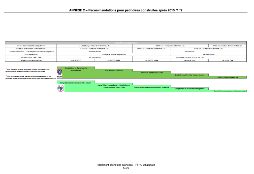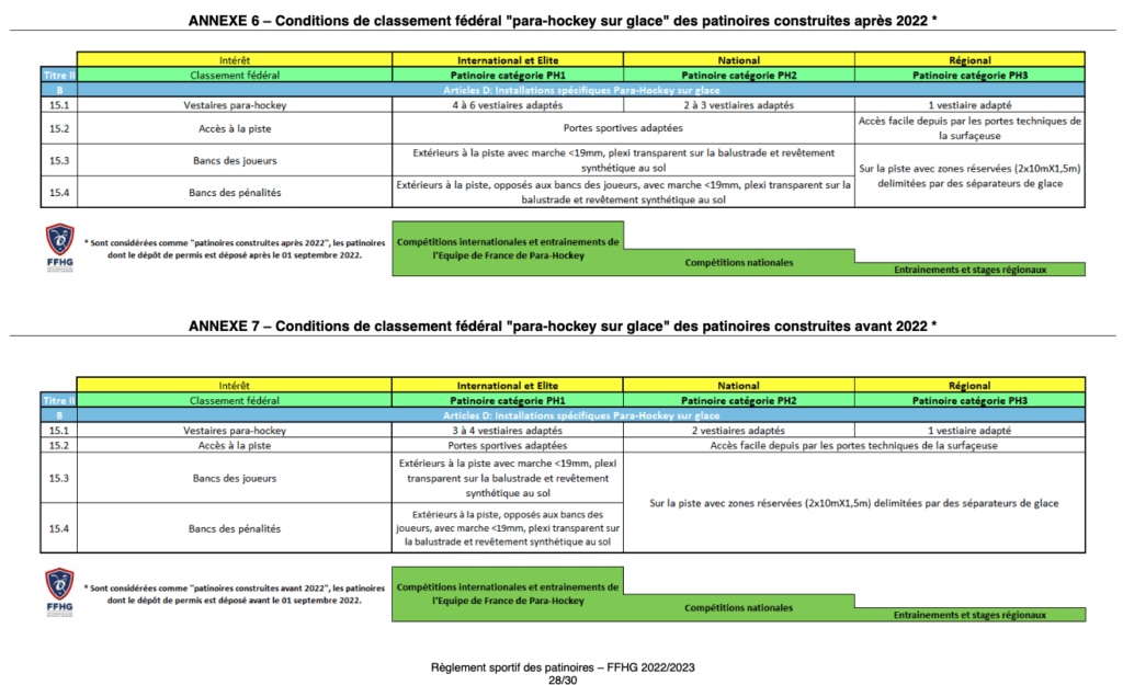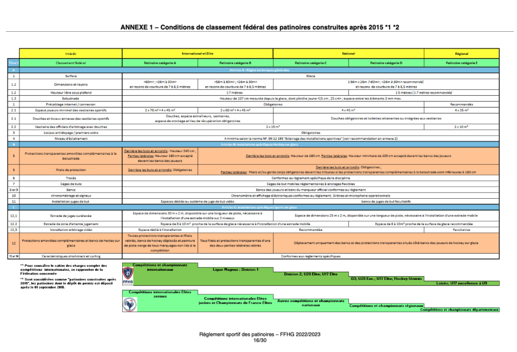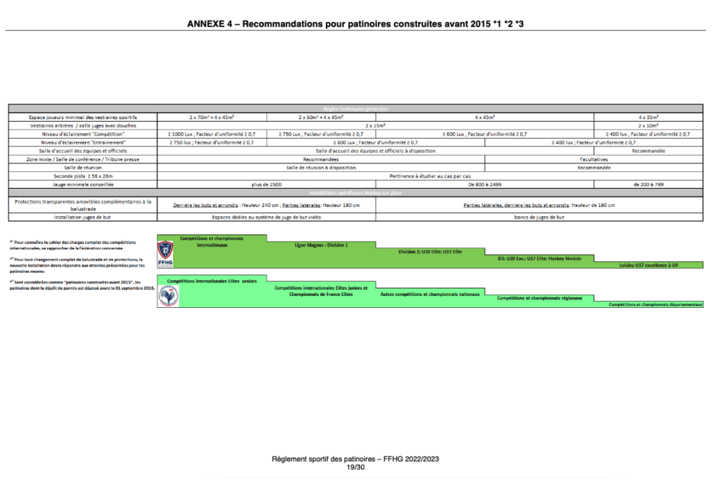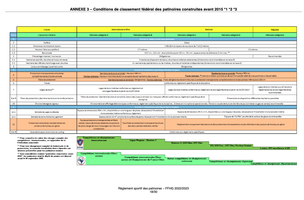 Le règlement distingue les règles applicables pour les patinoires construites avant 2015 entre 2015 et 2022 et aprés 2022.