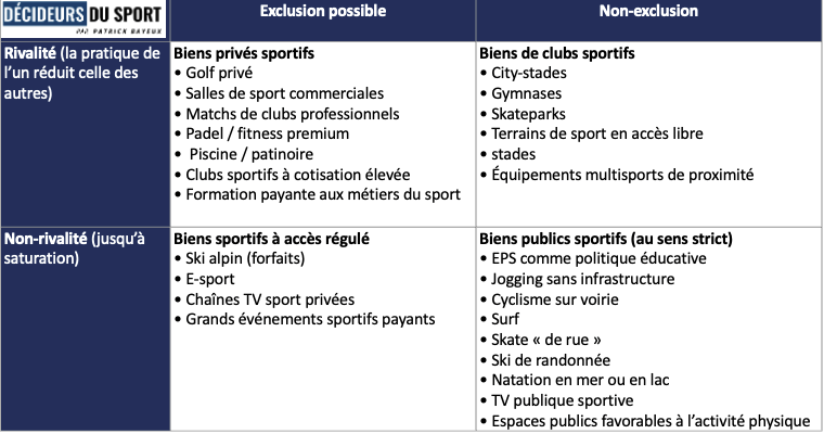 Le sport, pour sa part, n’est que rarement un bien public au sens strict. La majorité des équipements et des services sportifs relèvent de biens privés ou de biens de club : ils sont rivaux, souvent excluables, et donc, en théorie, marchandisables. Pourtant, ils sont massivement financés par la puissance publique