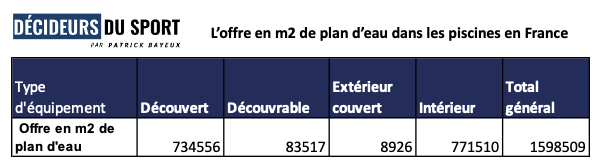 Selon le recensement des équipements sportifs et pour les seules piscines ouvertes toute l’année, l’offre en m2 de plan d’eau est de 800 000 m2 soit une offre de nature à répondre aux besoins scolaires y compris dans une hypothèse haute