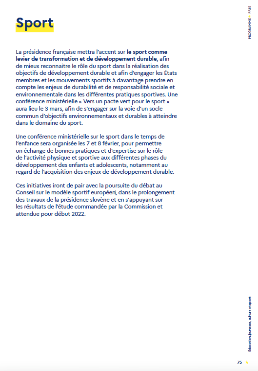 Accueil › Actualités › Pacte vert pour le sport, sport et temps de l’enfance et modèle sportif au programme de la présidence du Conseil de l’union Européenne de la France