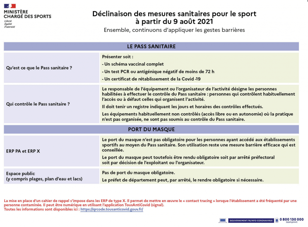 Le Décret n° 2021-1059 du 7 août 2021 modifiant le décret n° 2021-699 du 1er juin 2021 prescrivant les mesures générales nécessaires à la gestion de la sortie de crise sanitaire a été publiée au JO du 8 aout. Les personnes majeures doivent présenter un pass sanitaire (Le résultat d’un examen de dépistage, d’un test ou d’un autotest, un justificatif du statut vaccinal) pour pouvoir accéder aux équipements sportifs.