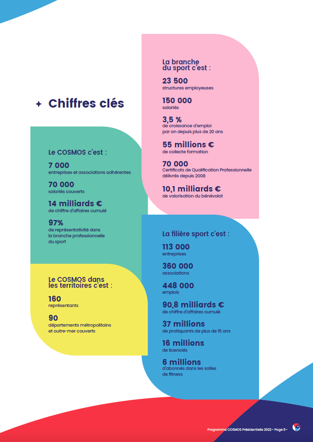 « Réunis autour de 5 grands enjeux, nous sommes convaincus de la force du sport comme créateur d’emplois et de valeur, facteur d’inclusion sociale et d’insertion, enjeu de santé  publique et acteur de la transition  écologique et numérique. » souligne l’organisation patronale.