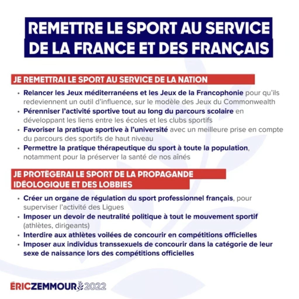 Quelles sont les premières mesures que prendra Eric Zemmour dans le domaine du sport si il est élu président de la république ?