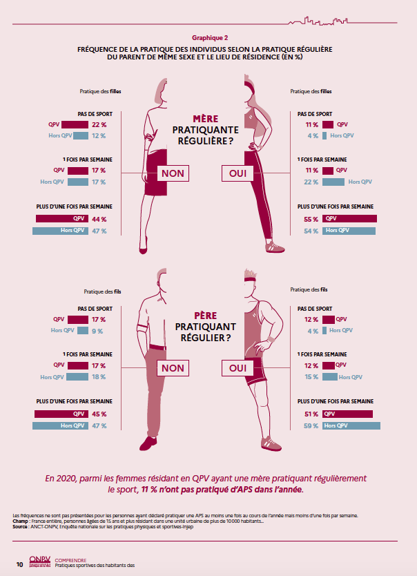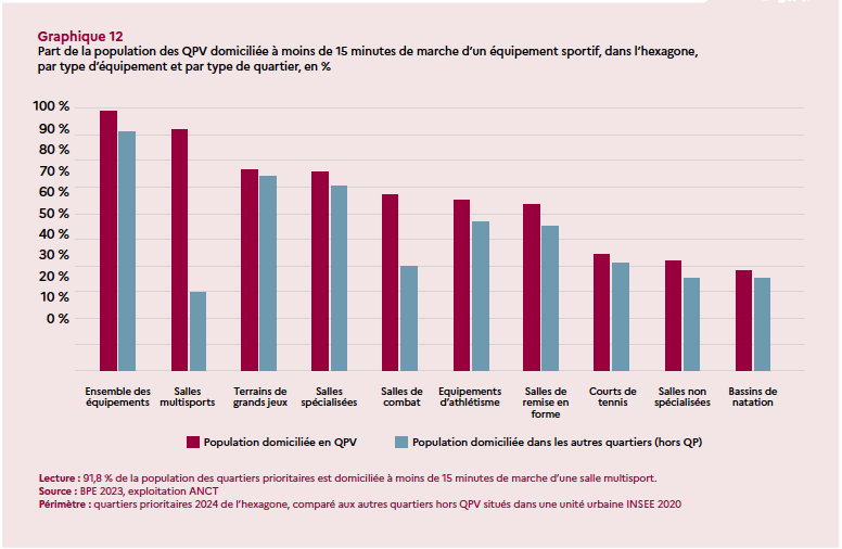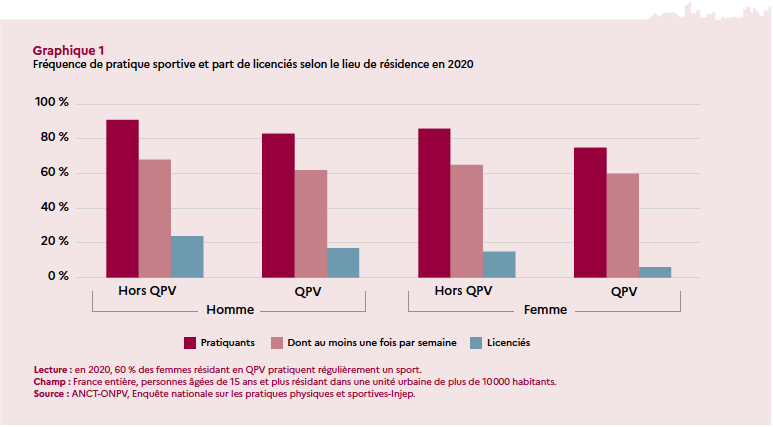 DES HABITANTS ET ÉQUIPEMENTS SPORTIFS DANS LES QUARTIERS PRIORITAIRES DE LA POLITIQUE DE LA VILLE » confirme que les habitants des quartiers prioritaires pratiquent moins de sport que les autres urbains (78 % contre 89 %).