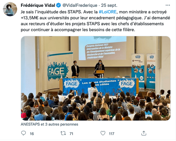 L’ANESTAPS fait référence à un tweet de la ministre de l’enseignement supérieur.