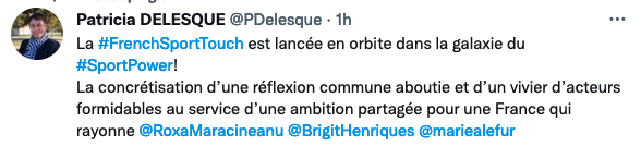 La #FrenchSportTouch est lancée en orbite dans la galaxie du #SportPower! La concrétisation d’une réflexion commune aboutie et d’un vivier d’acteurs formidables au service d’une ambition partagée pour une France qui rayonne » lançait sur twitter la Conseillère Relations Internationales DIGES – Délégation Interministérielle aux Grands Evènements Sportifs.