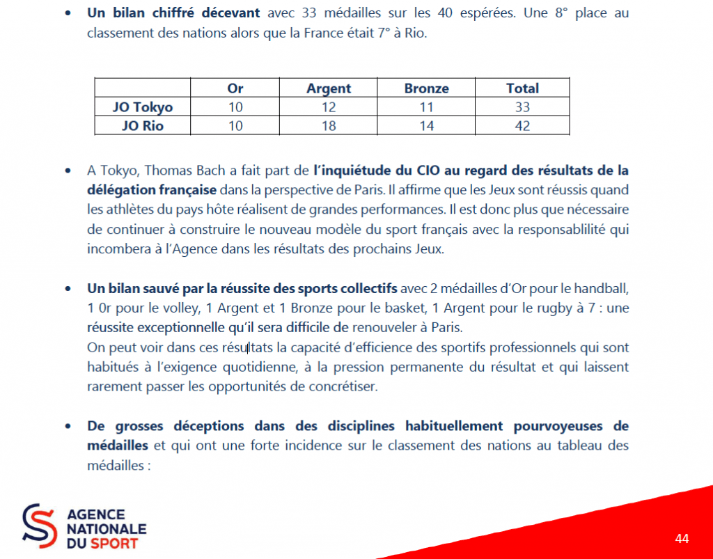 Il présentera également le bilan au CA de l’agence nationale du sport Jeudi 7 octobre. Dans les documents envoyés en amont du CA, le bilan est sans concession.
