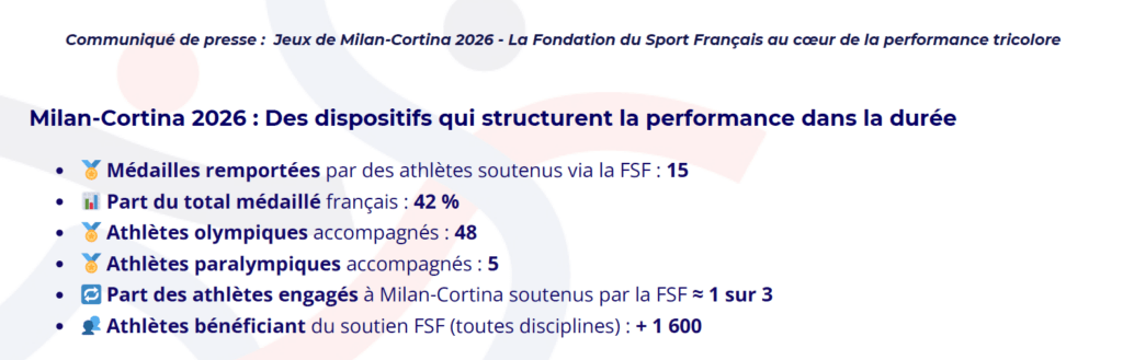 Aux Jeux olympiques et paralympiques d’hiver de Milan-Cortina 2026, 15 des 35 médailles françaises ont été remportées par des athlètes soutenus par la Fondation du Sport Français, illustrant l’impact de ses dispositifs d’accompagnement sur la préparation et la performance des sportifs.