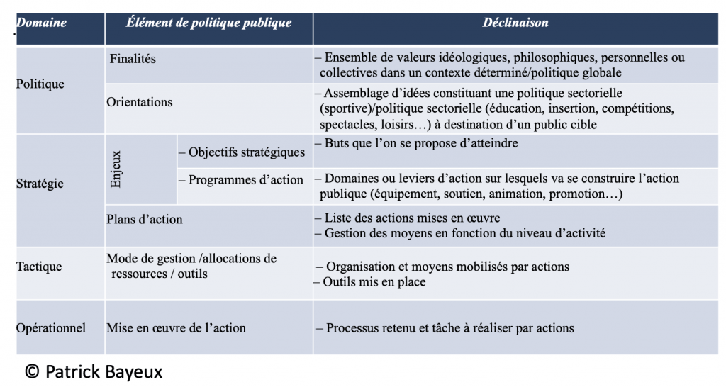 - le niveau politique : relève de la décision des élus et consiste à définir des grandes orientations politiques au regard de valeurs personnelles ou collectives dans un contexte déterminé ;