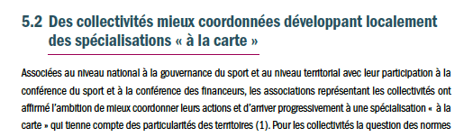 . Les projets sportifs territoriaux dont les priorités méritent d’être resserrées devraient comporter, au-delà des orientations générales, des plans d’action détaillés. Par ailleurs, les modalités par lesquelles seront assurées la coordination et la complémentarité des projets sportifs territoriaux et des projets sportifs territoriaux doivent être précisées. Si l’engagement des collectivités territoriales et notamment des régions sera déterminant, la mise en place de cette gouvernance territoriale du sport suppose un accompagnement renforcé de la part de l’Agence nationale du sport et de la direction des sports dont les rôles respectifs en ce domaine doivent être clarifiés. »